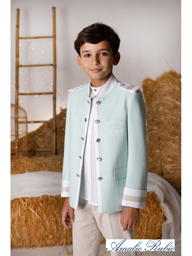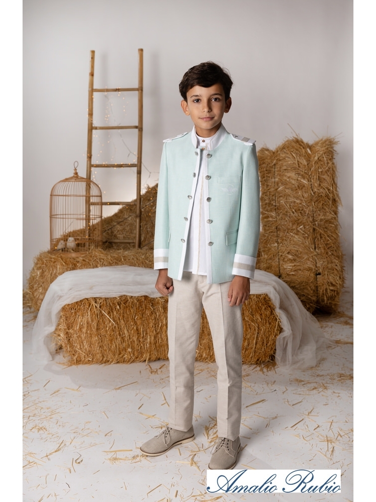 Almirante de comunión chaqueta abierta en color verde agua con adornos en arena, pantalón arena, camisa de lino con pasamanería central en color arena y verde agua.