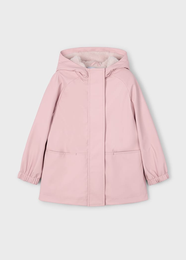 Chubasquero de manga larga para niña con puños elásticos. Cuello con capucha. Cierre central delantero con cremallera. Suave forro interior de poliéster. Bolsillos funcionales en la parte delantera.