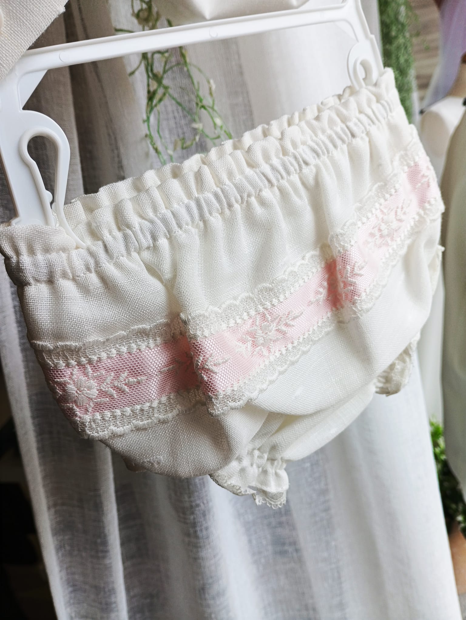 Conjunto de 3 piezas tejido lino mezcla con puntilla y lazo en color rosa bebé, corte sin manga fresquito para esos días de calor.
