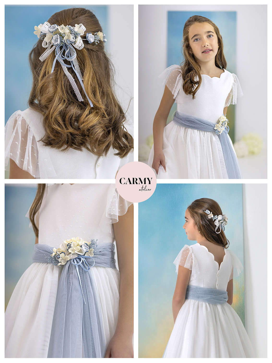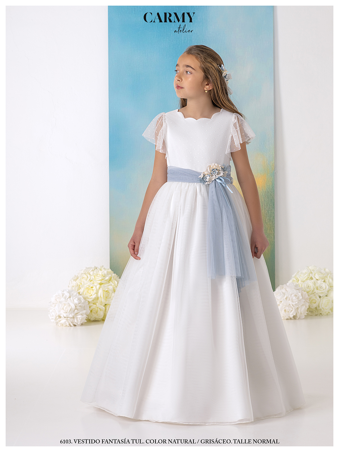 Vestido de comunión en tul de color natural, delicado y elegante. El cuerpo está confeccionado con tejido de topos que aporta textura y encanto, y cuenta con un escote de ondas que resalta la delicadeza del diseño. Incluye un cinturón en tul azul/grisáceo adornado con pequeñas flores, añadiendo un toque de color y fantasía a esta hermosa prenda.