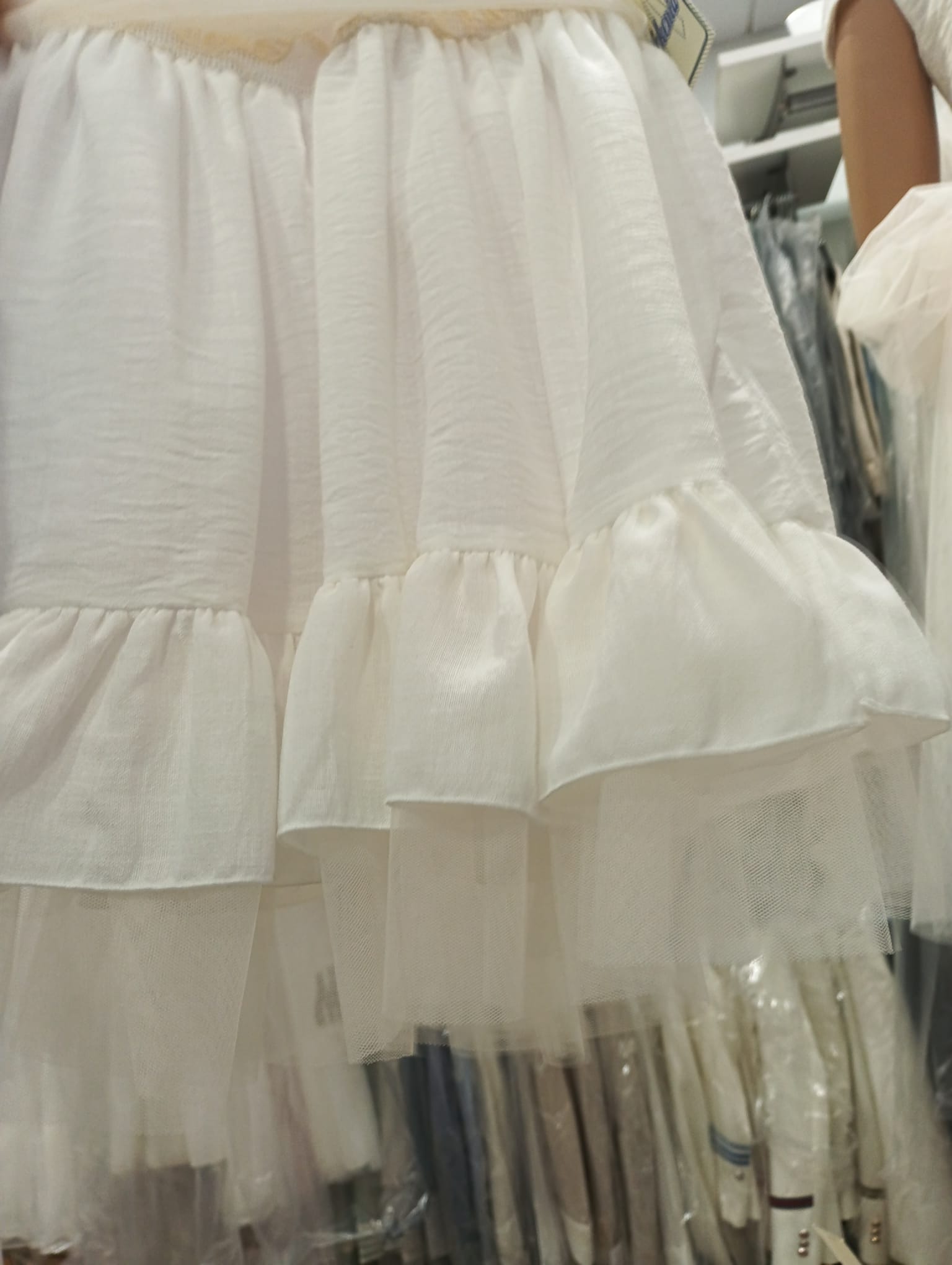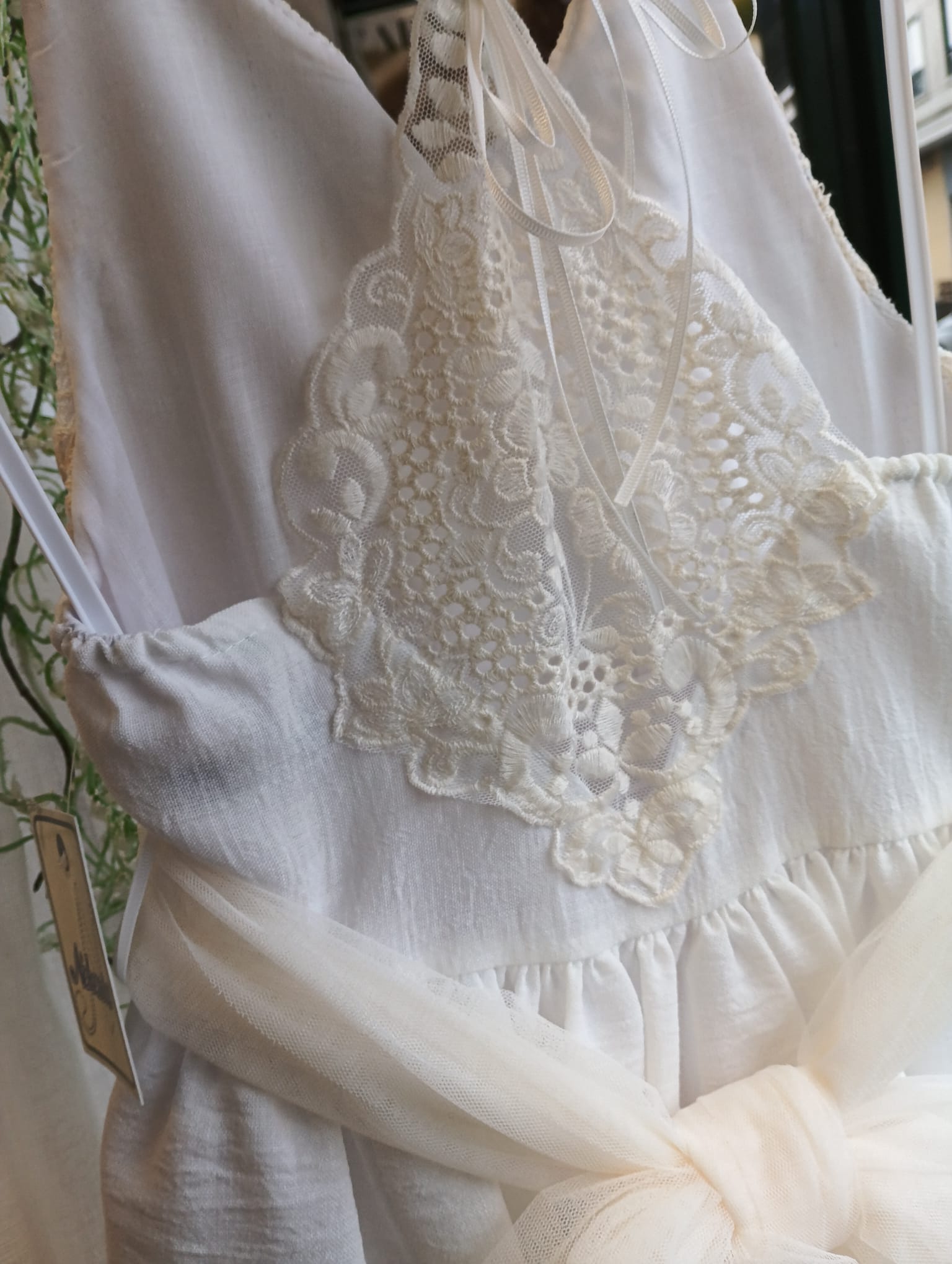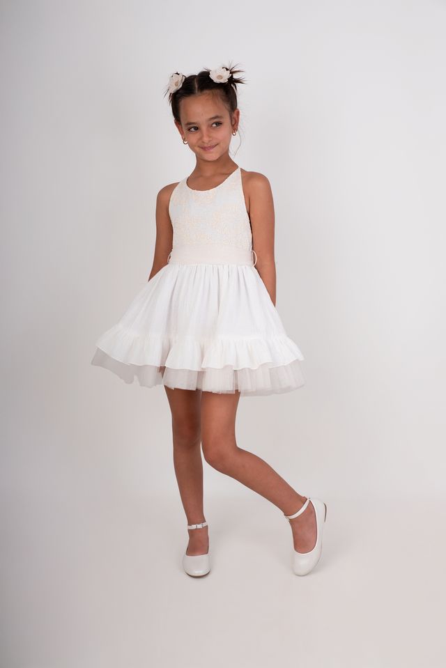 Nuevo vestido de ceremonia tirantes para niña para esta primavera verano, confeccionado en blanco roto con fajín de tul en color crudo, donde destaca su preciosa espalda. FABRICADO EN ESPAÑA.